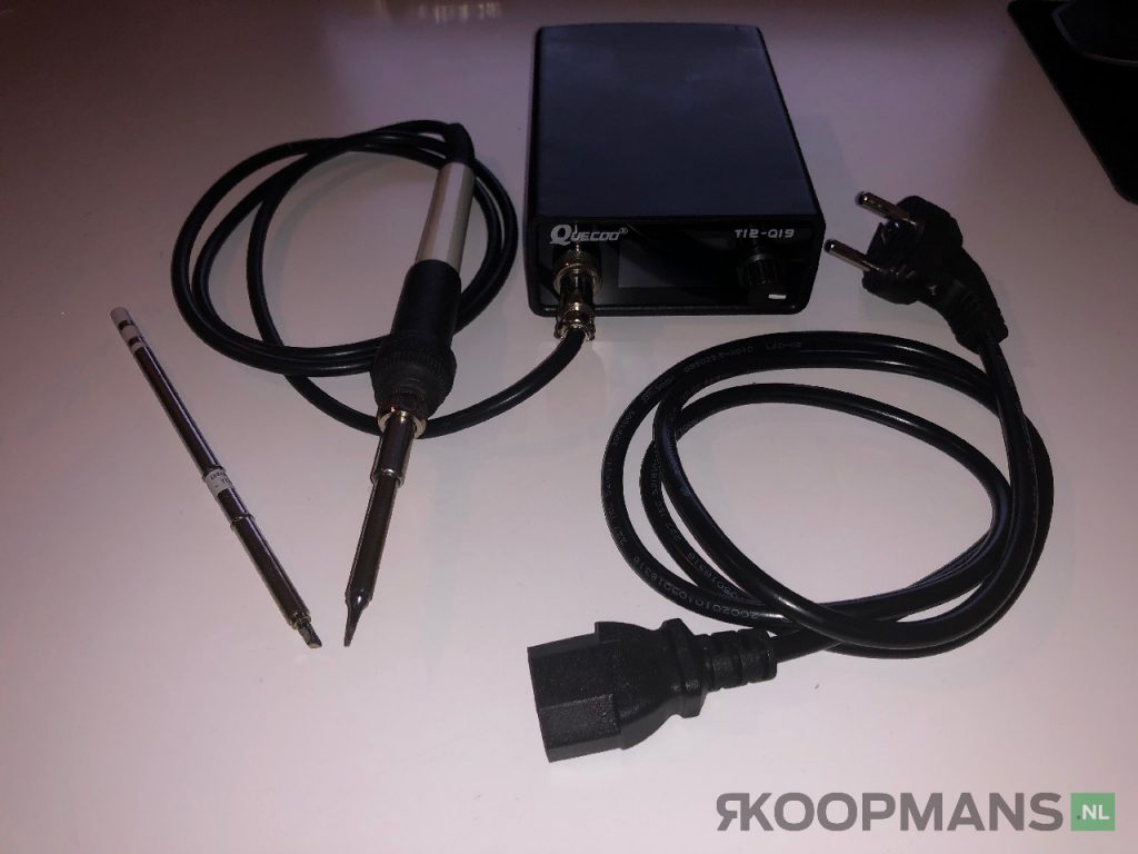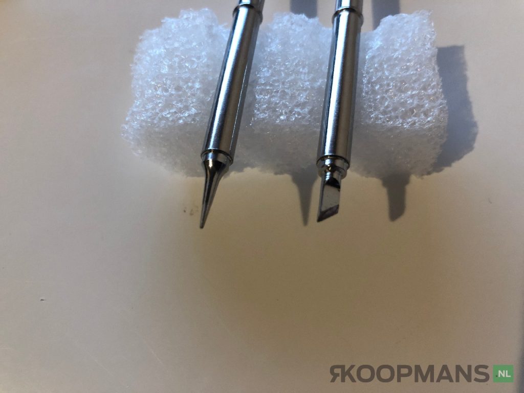 De bout voel solide en degelijk aan en heeft een mooie flexibele kabel van circa één meter, dit is een prima werk lengte al hebben mijn Weller soldeerstations een lengte van 1,4 meter. Bij deze set zaten twee verschillende soldeerstiften; een mooie smalle puntstift (0,7 mm) waar ik persoonlijk graag mee werk en een brede platte punt (3,2 mm).