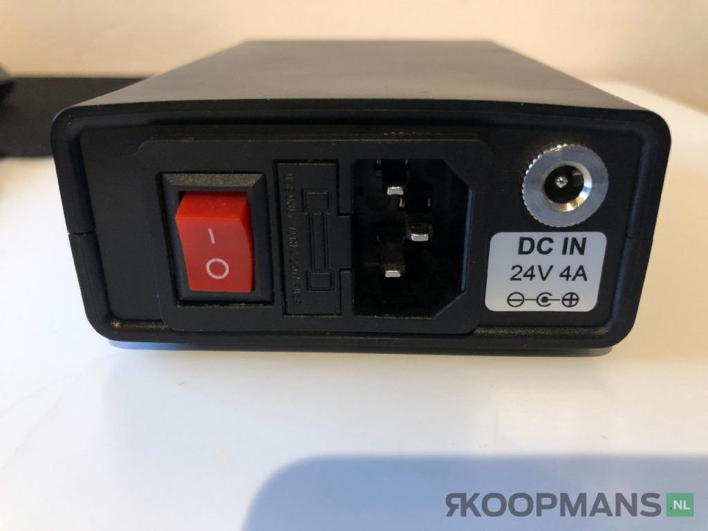 Aan de achterzijde vinden wij een rode aan/uit-schakelaar, zekering (Fast 3 Ampère), aansluiting (C14) voor een 230V kabel (C13) en daarnaast een aansluiting voor een 24 Volt 4 Ampère DC adapter.